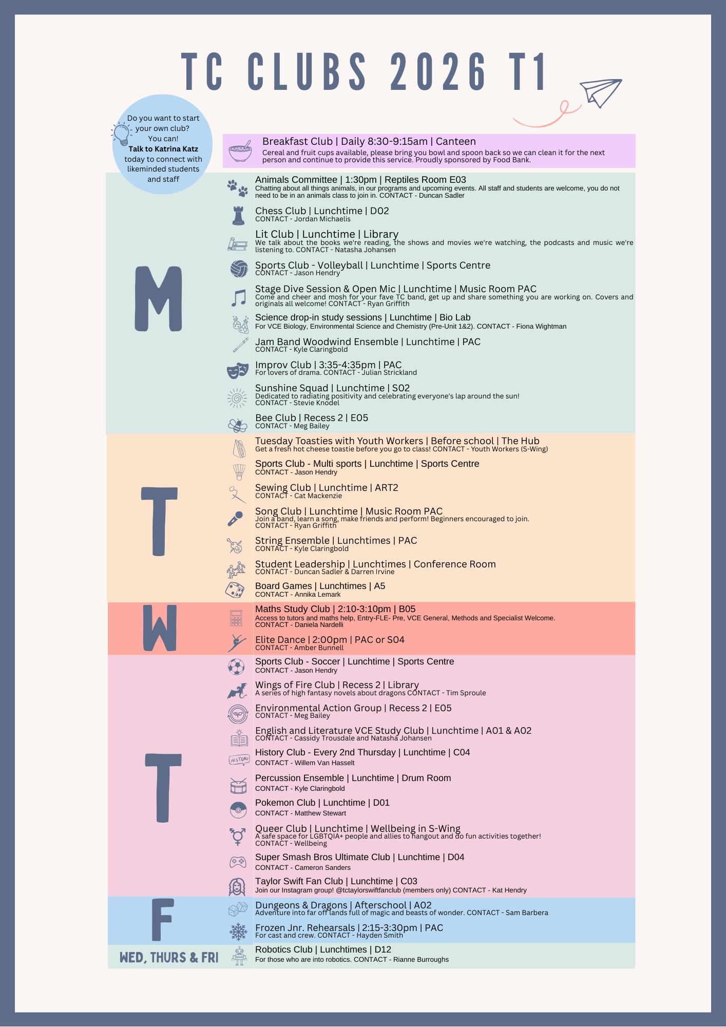 The Clubs poster is updated once each term, however club changes or new clubs can be discussed with Katrina Katz at any time.