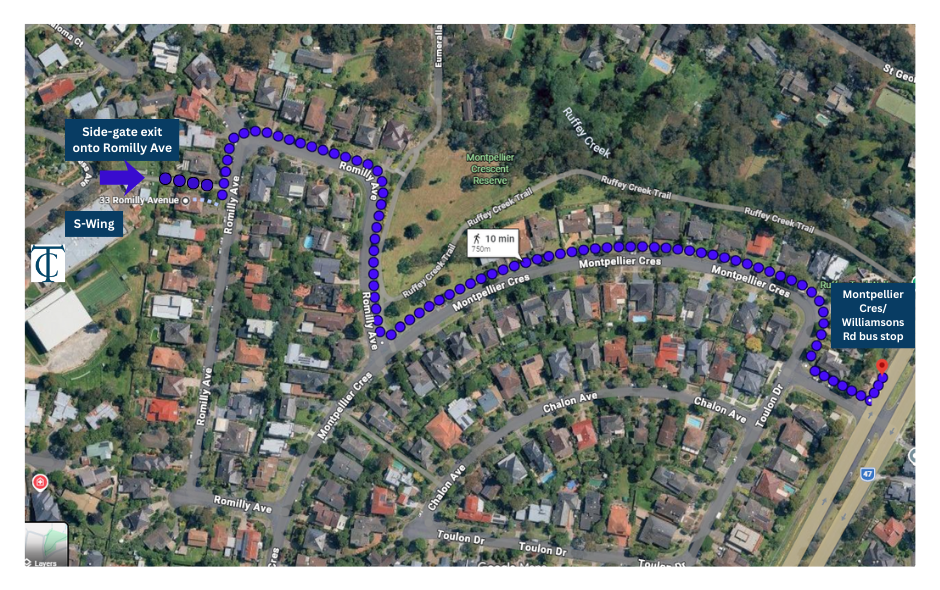 Students travelling on the Diamond Creek or Research buses and getting off at the Eltham shops or Eltham Station are encouraged to use the route 902 PTV bus. To access this service, exit the school via the gate behind S-Wing, walk to the corner of Montpellier Crescent and Williamsons Road. This bus will stop in Eltham at the Eltham train station/Eltham Shops.